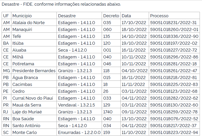 Read MoreEstão na lista municípios do Amazonas, Bahia, Ceará, Paraíba, Pernambuco, Piauí, Rio Grande do Norte, Minas Gerais, Rio de Janeiro,